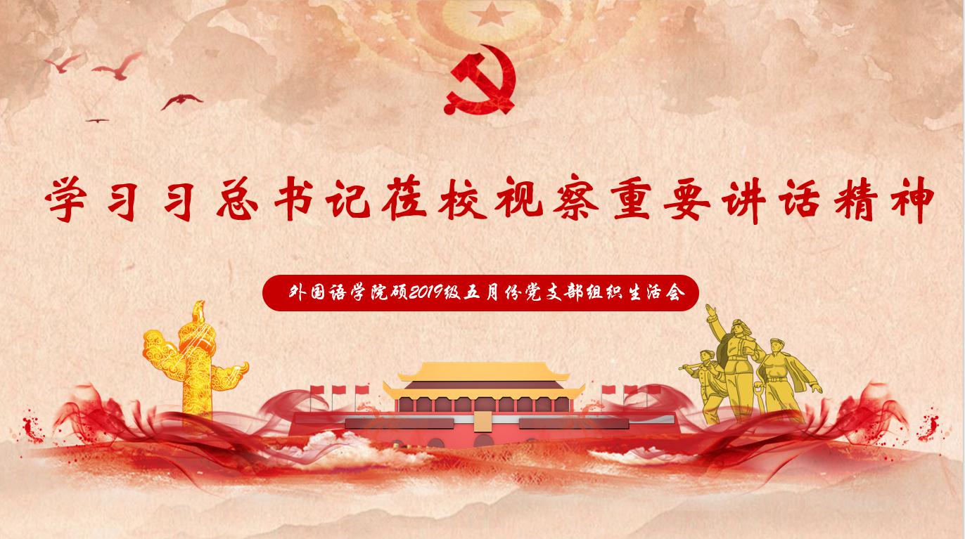 硕2019级辅导员康晋楠老师、党支部全体学生党员及积极分子,主持人为傅俊豪同志。会议由“学习习总书记莅校视察重要讲话”及“学习习总书记五四青年节寄语”两个部分组成。