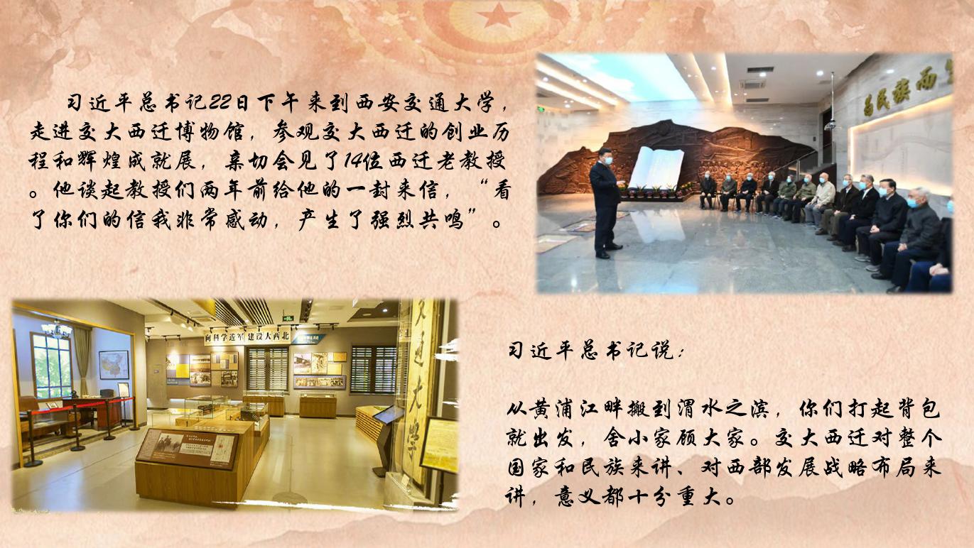 ,走进交大西迁博物馆,参观交大西迁的创业历程和辉煌成就展,亲切会见了14位西迁老教授。他谈起教授们两年前给他的一封来信,“看了你们的信我非常感动,产生了强烈共鸣”。