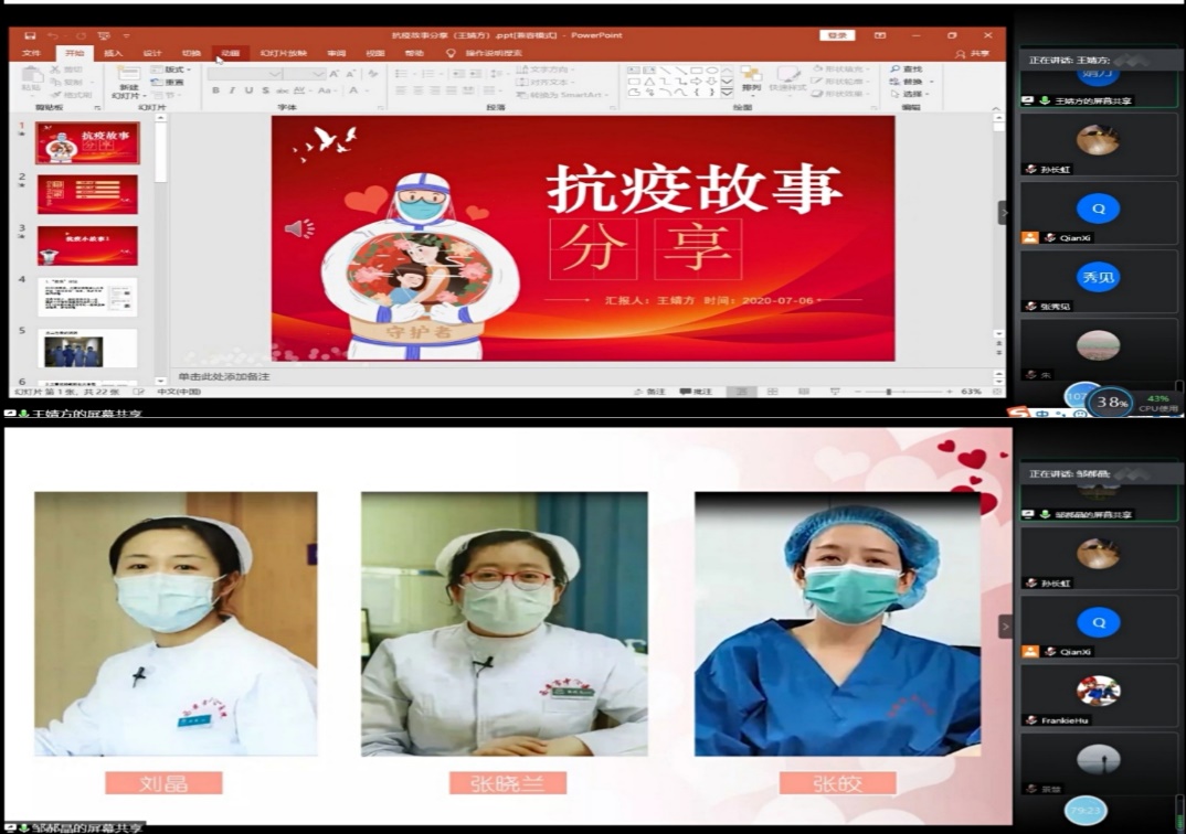 邹郝晶老师讲述了自己的中学同学,我市中心医院护士长和她的同事们的感人故事。长安大学的王婧方老师讲述了自己的妈妈,作为一名一线医务工作者在疫情期间如何忘我工作,照顾发热病人的事迹。两位老师的讲述深情并茂,感悟真挚,让所有参会党员感动不已,同时觉得内心充满温暖和力量。党员老师们纷纷表示要在自己的岗位上发挥党员的先锋模范带头作用,为西部教育事业的发展贡献力量。