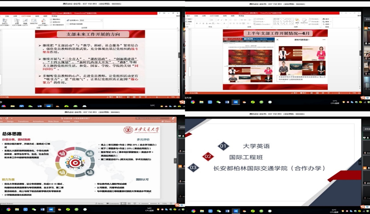 随后,两位支部书记钱希、景慧分别就本支部上半年开展的活动和党员教师在教学科研等方面取得的成绩做了简短汇报,并规划和布置下半年支部工作。大学英语基础教研室党支部开展的“课程思政”专题研讨,“我心中的四面旗帜”系列微党课录制等活动得到了长安大学污污漫