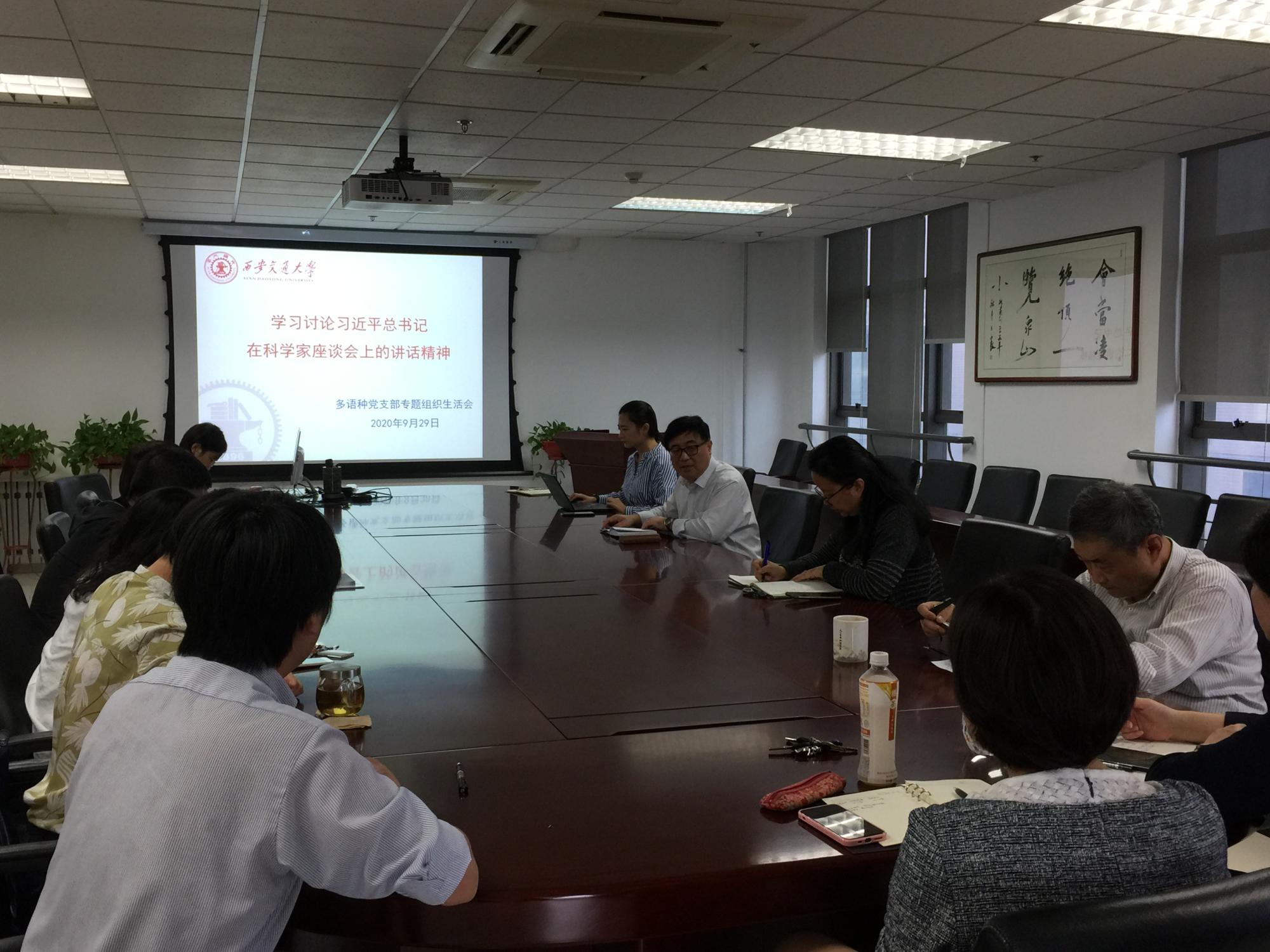 多语种教工党支部在外文楼B912会议室召开专题组织生活会,学习讨论习近平总书记在科学家座谈会上的讲话精神。会议由污污漫