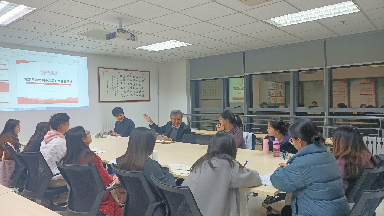 硕2018级党支部于逸夫外文楼B711召开专题组织生活会,学习讨论党的十九届五中全会精神,本次会议由李听炎、高明瑜主持。学院党委书记张长安参加会议。