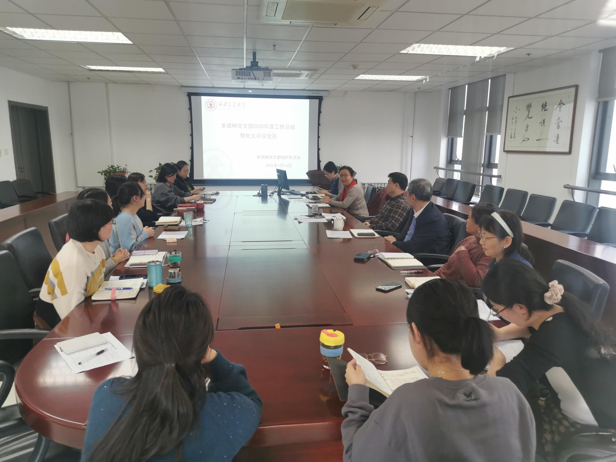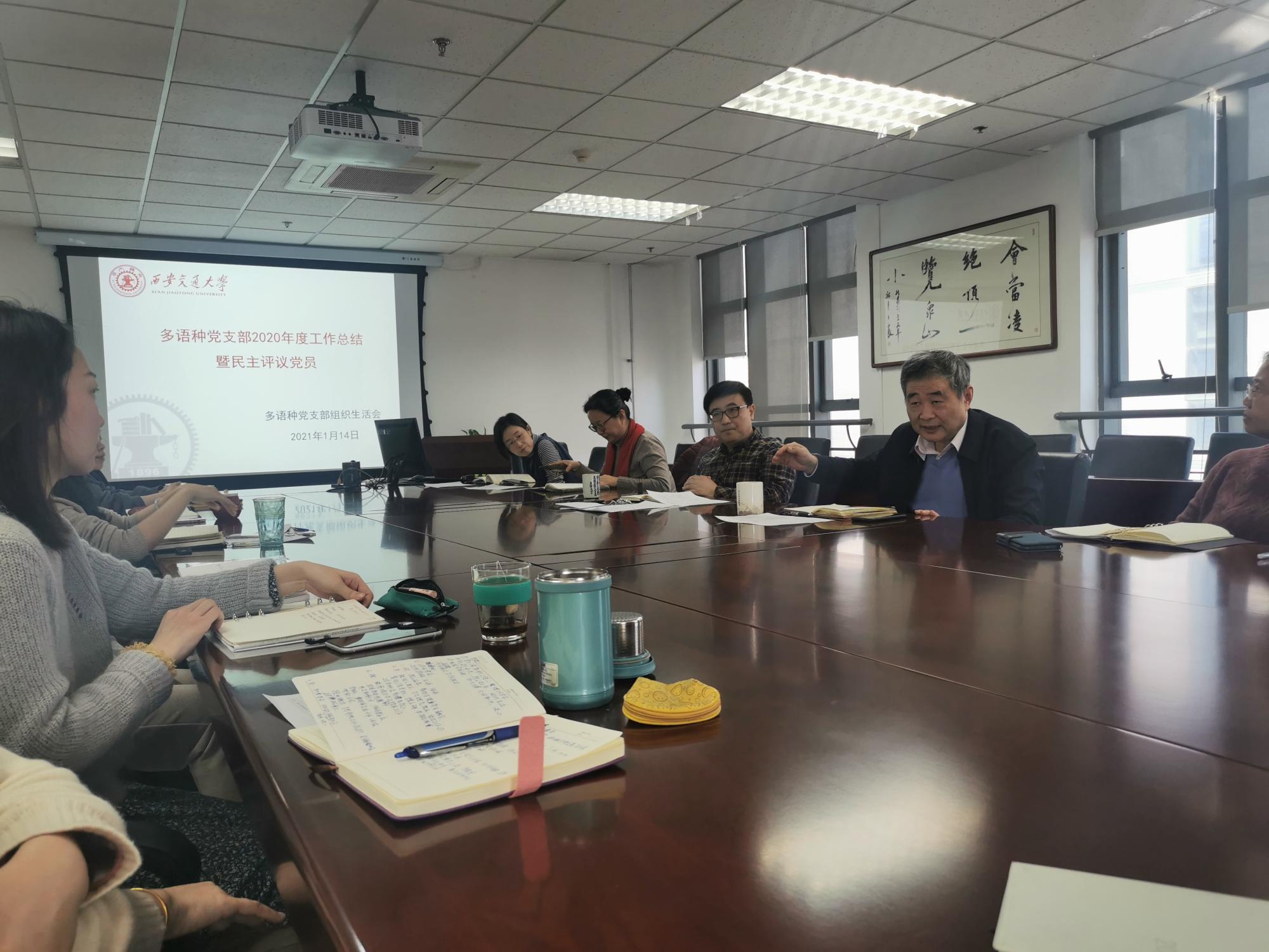 多语种教工党支部在外文楼B912会议室召开支部扩大会议,总结2020年支部工作及民主评议党员。会议由污污漫