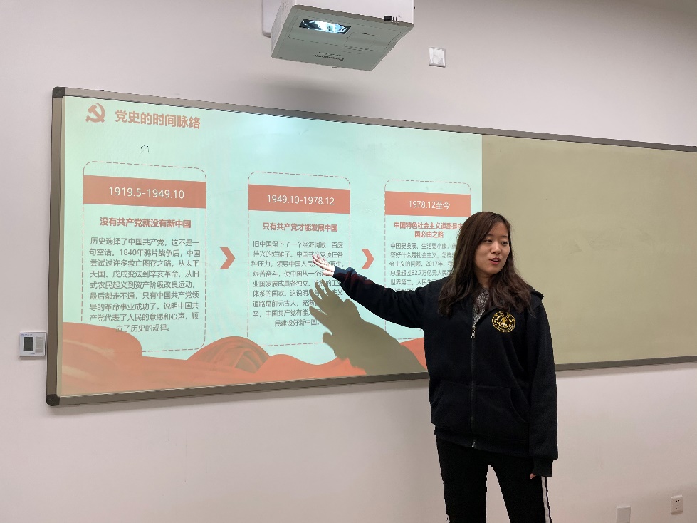 首先,党支部书记郭顺鑫向支部成员梳理了中国共产党历史的主要发展脉络。她指出,认真学习党史定能增强我们对党的感情认同、理论认同、政治认同,对继承和发扬光荣革命传统、党的优良作风,对提高自己的认识能力和处理实际问题的能力都是十分必要和有益的,并将党史分为没有共产党就没有新中国、只有共产党才能发展中国、中国特色社会主义道路是中国必由之路三个阶段进行了解读。
