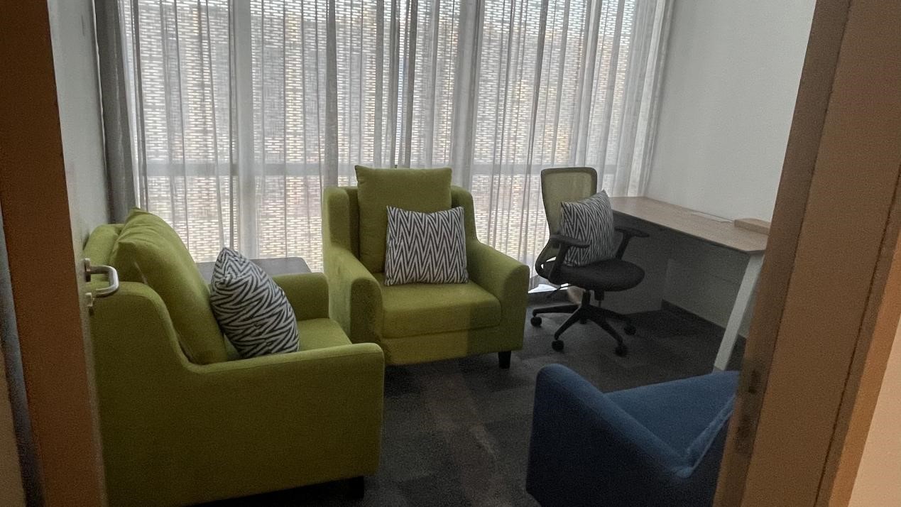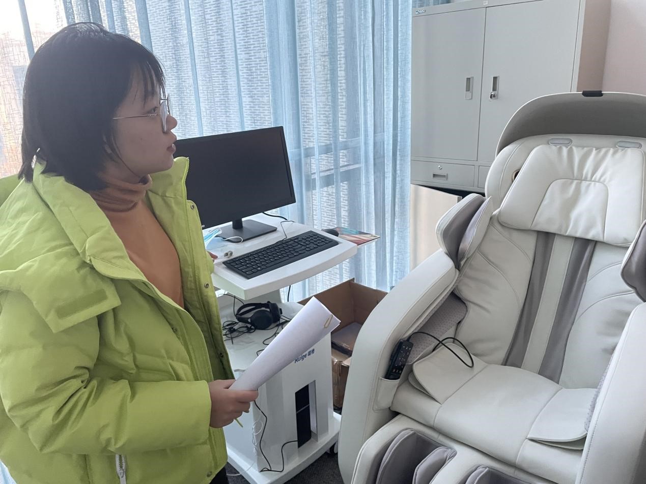 最后,同学们来到了放松按摩室。亢滢详细介绍了按摩椅和头部按摩仪的使用方式和放松作用,并邀请两位同学在参观结束后进行亲身体验。体验按摩后,两位同学均表示自己的身心得到了极大程度的放松,今后在需要时会选择再次来到此处寻求帮助。