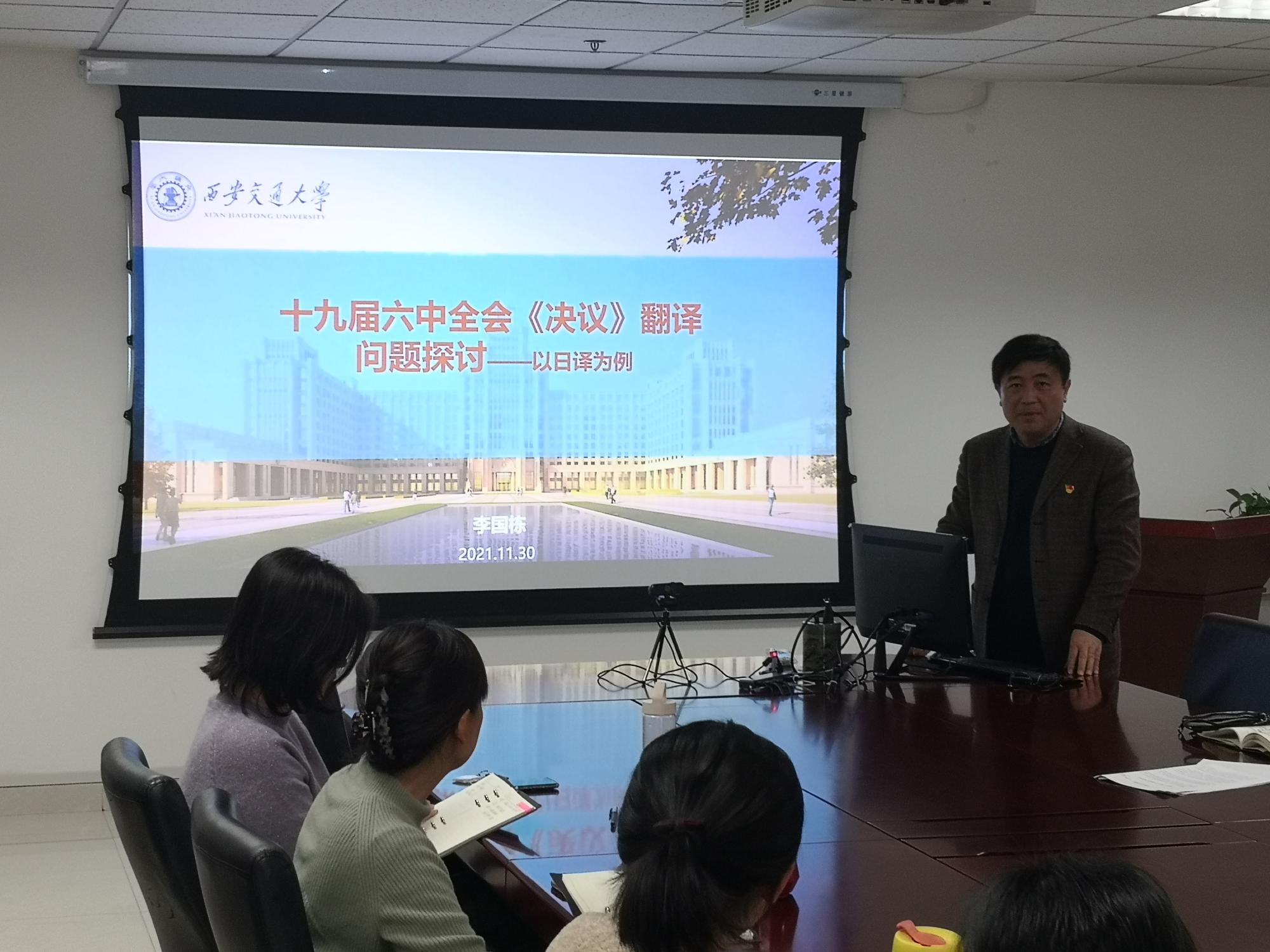 李国栋以“十九届六中全会《决议》翻译问题探讨”为题做专题发言,对党的十九届六中全会精神进行了系统宣讲和深入解读,谈了自己的学习体会。《决议》是一篇马克思主义的纲领性文献,是新时代中国共产党人牢记初心使命、坚持和发展中国特色社会主义的政治宣言,是以史为鉴、开创未来,实现中华民族伟大复兴的行动指南。我们要认真学习全会精神,切实做好各项工作。