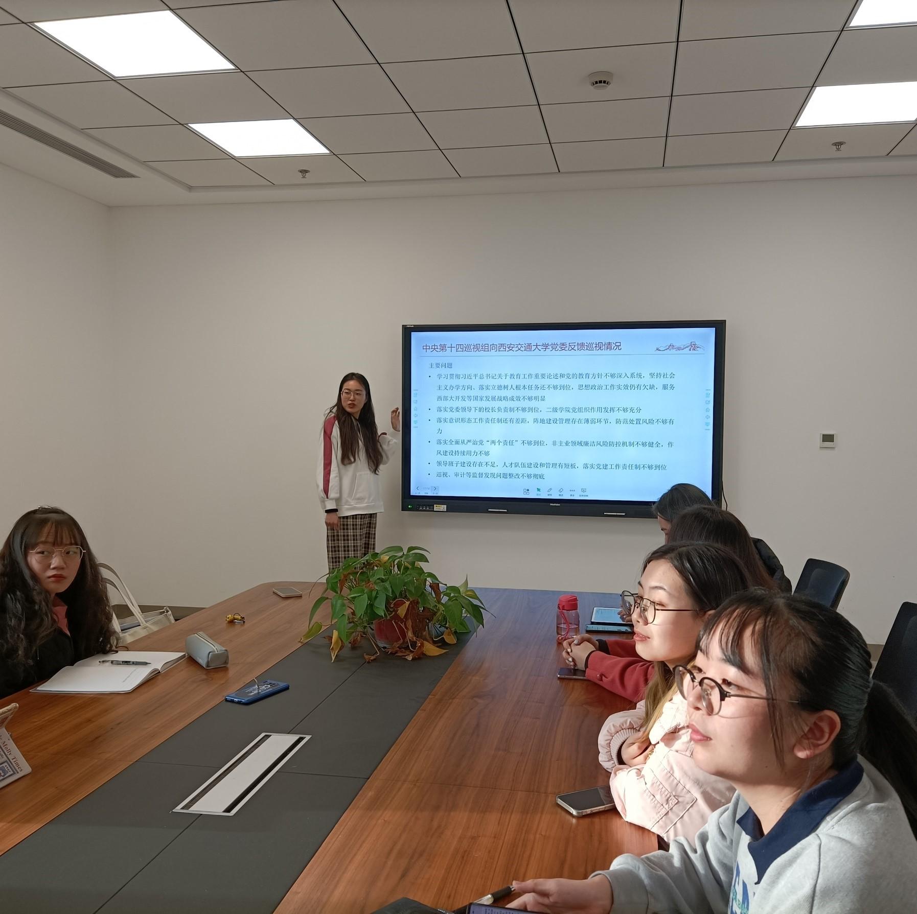 何静雯同志表示,目前我们学校正在加强思政教育,政治课形式内容丰富多样,专业课中敦促学生关心时政,将思政教育融入课堂,全校师生应继续努力,参与落实思想政治工作。薛思媛同志认为,我们应在党课中继续深入学习贯彻习近平总书记“七一”重要讲话和来校考察重要讲话精神,增强“四个意识”、坚定“四个自信”、做到“两个维护”,牢记“国之大者”,不断提高政治判断力、政治领悟力、政治执行力。罗倩同志补充了思政课的重要意义,同时建议思政课堂可以进一步改革创新,完善课堂形式。