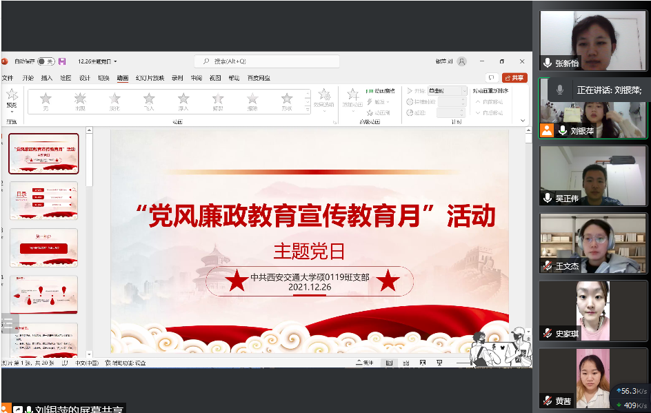 硕0119党支部开展以“党风廉政”为主题的党日活动。支部党员同志、发展对象和入党积极分子通过腾讯会议的形式在线上参会,党支部书记刘银萍主持会议。