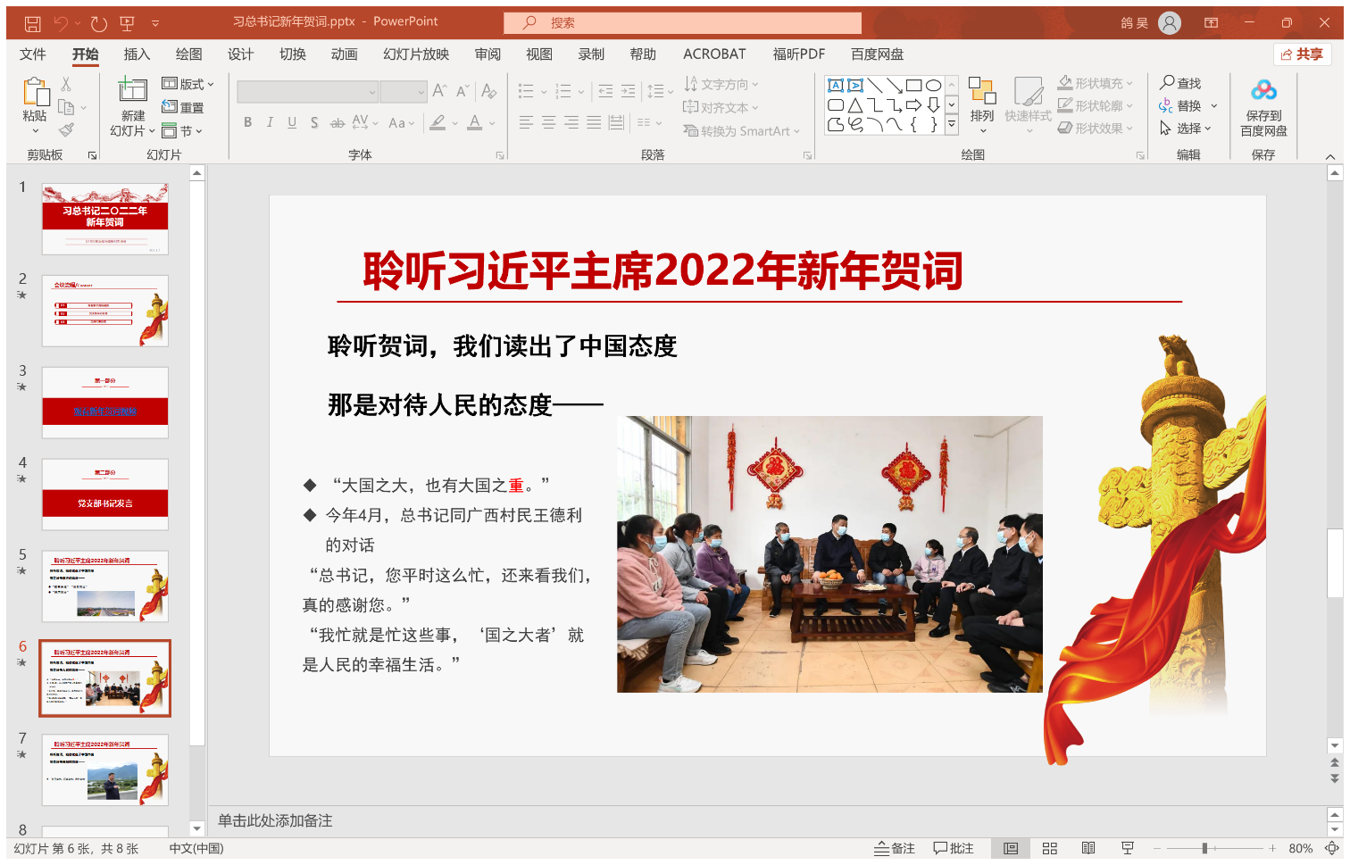 吴鸽带领大家观看了习总书记2022年新年贺词的视频,并从对历史的态度、对人民的态度、对自然的态度三个方面对习总书记的新年贺词作出了总结。吴鸽同学重点强调习总书记的新年贺词中对 “人民”的看重,并呼吁同学作为党员,要严格践行以人民为中心的发展思想,尊重群众意愿,为师生办实事解难题,有效保障改善民生,增强人民群众获得感、幸福感、安全感。