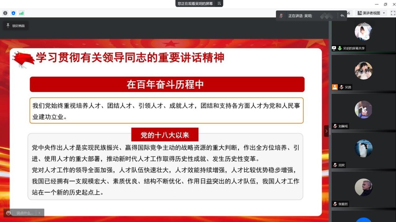 支部书记吴鸽同学带领大家全面总结学习了党的百年奋斗重大成就和历史经验,以新民主主义革命时期、社会主义革命和建设时期、改革开放和社会主义现代化建设新时期、以及中国特色社会主义新时代四个不同阶段党面临的主要任务为切入点,总结了中国共产党百年奋斗的伟大成就。随后,组织委员吴玥同学领学了2021年中央人才工作会议,强调我们要深入实施新时代人才强国战略,加快建设世界重要人才中心和创新高地。支部成员通过集体学习,对其中的要点有了更加深刻的认识和理解。