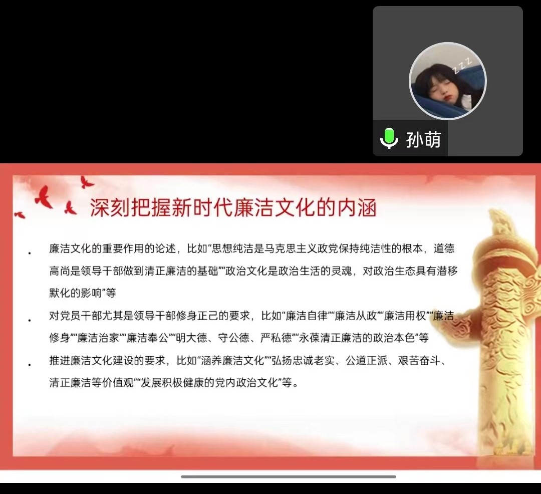 彭康书院师生联合第二党支部法语党小组围绕“新时代下党的廉洁文化建设”召开组织生活,由组长李欣宇主持,马毓乔、孙萌两位同学采用双语进行汇报。由于疫情影响,此次组织生活通过线上的方式进行。