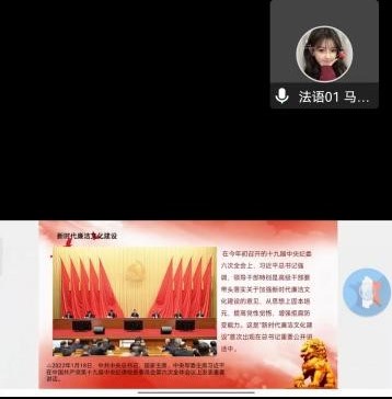 首先,马毓乔同学以十九届中央纪委六次全会上强调的“领导干部特别是高级干部要带头落实关于加强新时代廉洁文化建设的意见,从思想上固本培元,提高党性觉悟,增强拒腐防变能力”引出主题,同时孙萌同学用法语进行汇报。汇报不仅强调了加强新时代廉洁文化建设的重要性,还明确了加强新时代廉洁文化建设的具体要求。