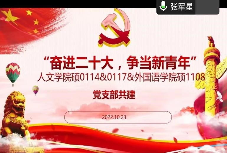 硕1108班党支部联合人文学院硕0114、0117班党支部召开“奋进二十大,争当新青年”专题组织生活,学习党的二十大精神,会议由硕1108班党支部书记张军星主持。