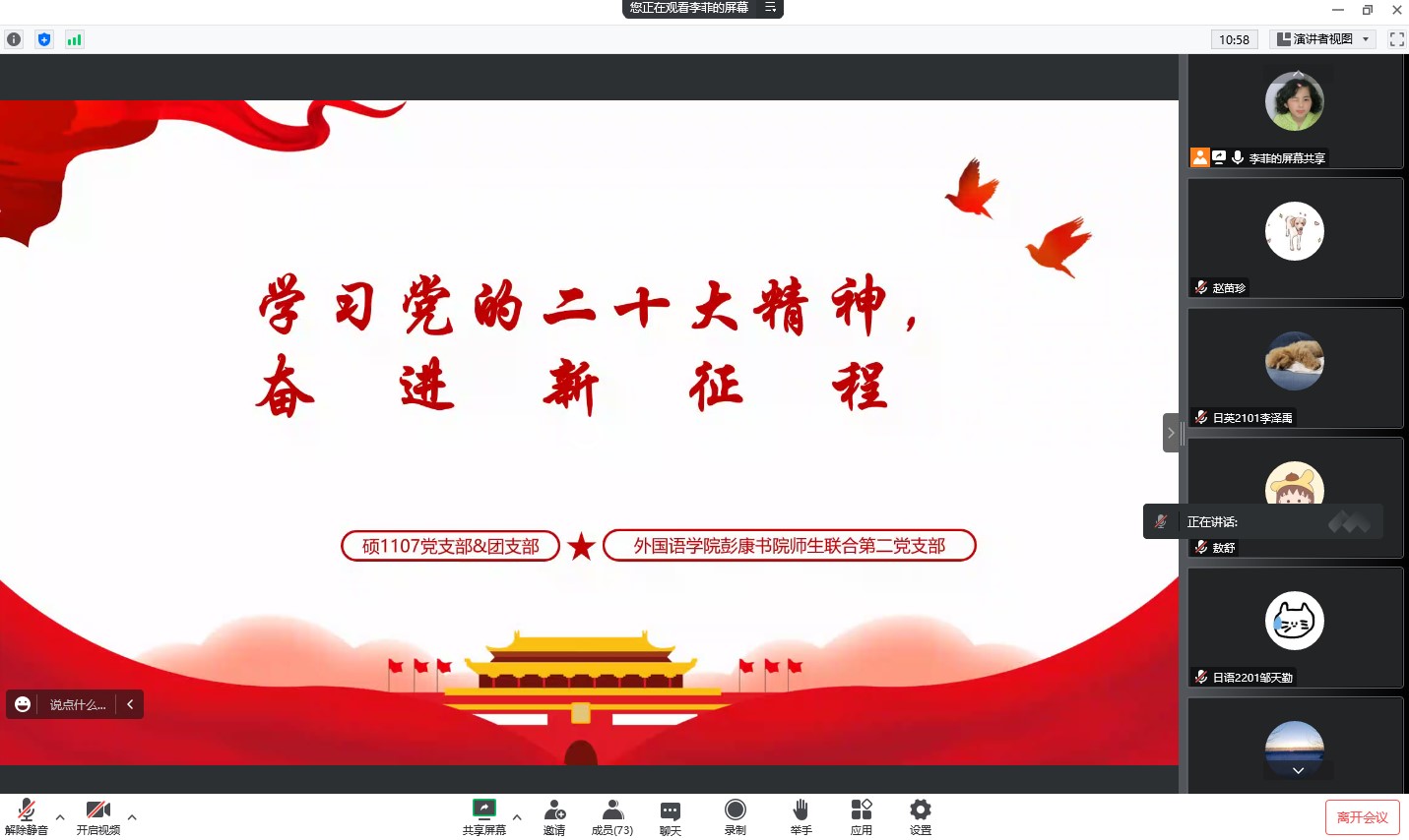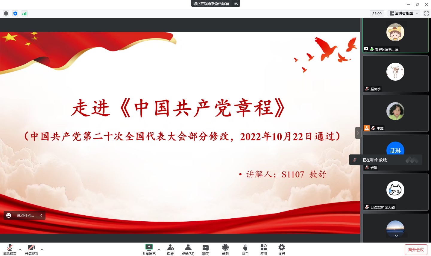 彭康书院师生联合第二党支部共同开展线上组织生活,学习研讨党的二十大报告精神和新修订党章内容。支部党员、积极分子等70余人参会。硕1107党支部书记李菲主持会议。
