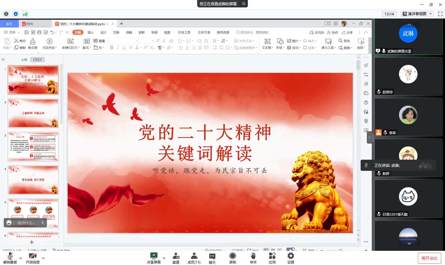 师生联合第二党支部书记武琳领学党的二十大报告关键词。她认为作为新时代的大学生,要高举中国特色社会主义伟大旗帜,全面贯彻新时代中国特色社会主义思想,弘扬伟大建党精神,还要加强党史学习,从党的百余年奋斗经验中汲取精神力量和实践动力,为全面建设社会主义现代化国家、全面推进中华民族伟大复兴而团结奋斗。