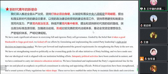 王宇璐以新时代青年的新使命为主题,领学党的二十大双语报告中对新时代青年的重要责任,在短语介绍与词汇讲解的同时,还对报告中的金句进行了分析。陈思颖围绕党的十二大报告特色词条、词汇解析以及短语积累三个方面为大家进行了精彩介绍。