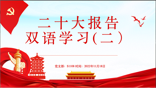硕1108班党支部于11月18日开展了第二期党的二十大报告双语学习活动,本期活动由支部党员张慧敏、王茜、王宇璐、陈思颖分享学习感悟。支部组织本班党团群众共同参加此次学习。会议由党支部组织委员梁启明主持。