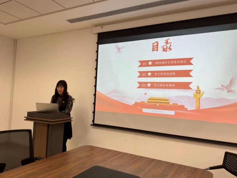 随后,支部书记于欣欣总结硕2118支部在2022年度工作,进行述职报告,分别从支部基本情况、建设成果和问题总结与未来展望进行汇报。于欣欣首先肯定了所有党员对于推动支部发展的重要作用,其次总结年度党员大会、党课、支委会以及党小组会开展情况,以及支部内科研学习和志愿服务等活动情况。然后,就支部目前存在的问题,支委会主动向党员同志征求工作改进方法和措施,形成了“三张清单”。随后,支委也表示会重点查摆政治功能和组织功能存在的问题和差距,及时改进,完善党员组织结构的合理性,充分调动党员的积极性;同时创新党内活动形式,全方位切实保障党支部工作的有效展开。