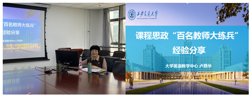 为深入学习宣传贯彻党的二十大精神,落实立德树人根本任务,发挥广大教师在课程教学中的育人作用,2023年4月12日下午,大学英语拓展教研室党支部、大学英语教学中心拓展教研室及大学英语教学中心拓展教研室工会小组在兴庆校区外文楼B座912会议室联合举办课程思政专题讲座。讲座由校第二届课程思政“百名教师大练兵” 特等奖获得者卢燕华主讲。