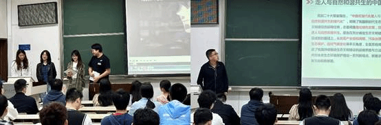 随后,人文学院崇实书院师生联合第二党支部的冉运涛同志对党的二十大报告中关于生态文明专题内容进行分享,从坚持人与自然和谐共生的中国式现代化道路出发,分别以积极谋划、细化要求、探索新方向、推进“双碳”目标等四方面介绍了党的二十大报告中关于生态文明的主要思想要义。