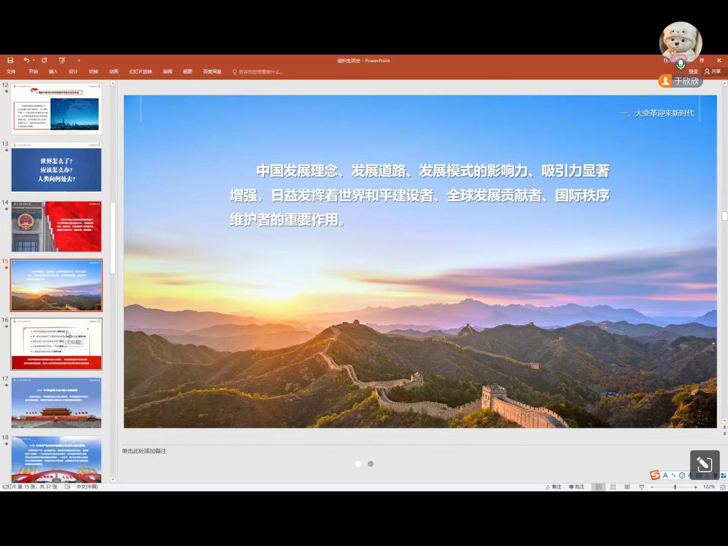 在习近平新时代中国特色社会主义思想专题学习中,党支书于欣欣首先从“新时代、新思想、新飞跃”展开,结合当今世界正处于百年未有之大变局的时代背景,与支部成员深入学习,系统掌握习近平新时代中国特色社会主义思想的主要内容,把握时代课题,将个人的奋斗融入时代大潮中,把实现个人理想和服务于国家人民有机结合,不仅要在学业上精进,追求真理,勇攀科研的高峰,更要“达则兼济天下”,心怀“国之大者”,想国家之所想,发挥一名党员应有的使命担当。