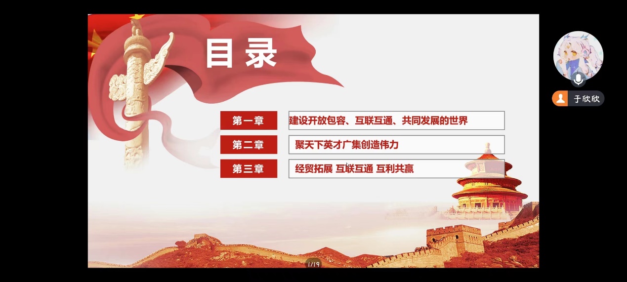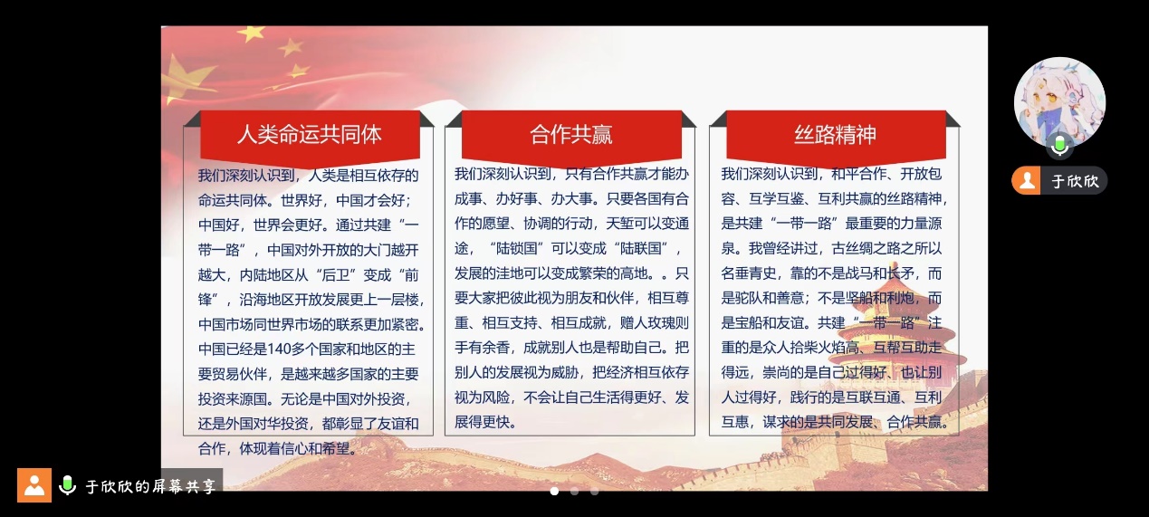 第三部分“经贸拓展互联互通互利共赢”中,于欣欣与支部成员共同以观看视频的方式回顾了在陕西西安举办的第七届丝绸之路国际博览会暨中国东西部合作与投资贸易洽谈会。丝博会一以贯之的是合作共赢的互惠理念,不断深化的是开放发展的坚定决心。丝博会这个高水平对外开放新窗口,得到了国际社会广泛而热烈的响应,给共建国家带来了实实在在的利益,为实现和平发展、互利合作、共同繁荣的世界现代化提供重要支撑。