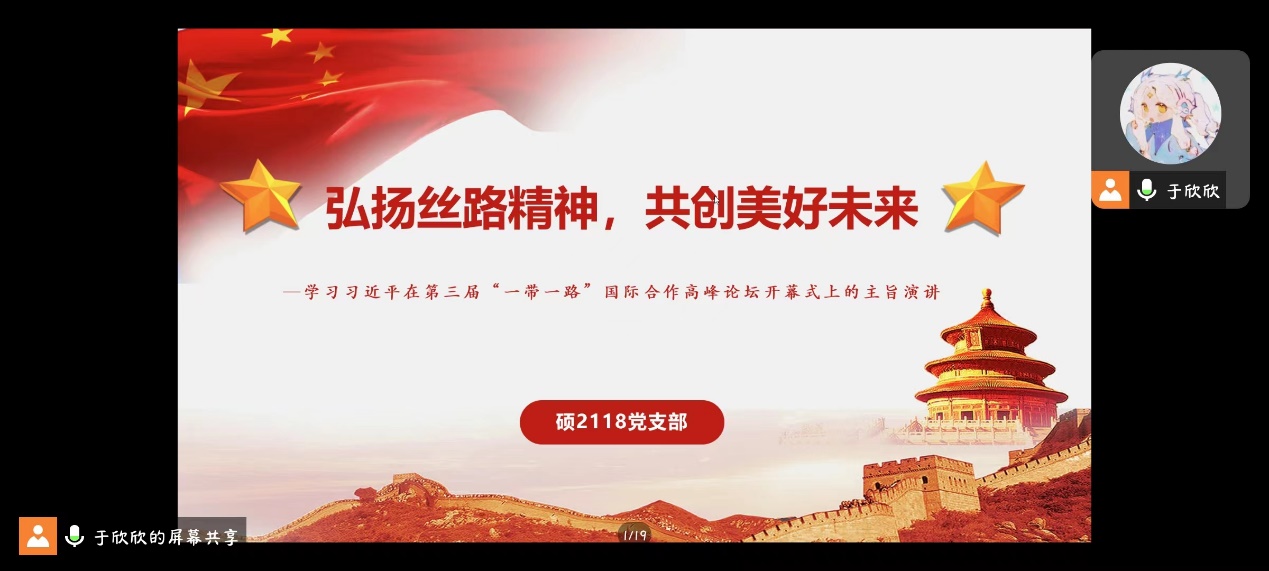 硕2118班党支部于11月29日在涵英楼5-5077会议室及线上腾讯会议举办“弘扬丝路精神,共创美好未来”主题党课,硕2118班党支书于欣欣主持,支部全体成员参与会议。