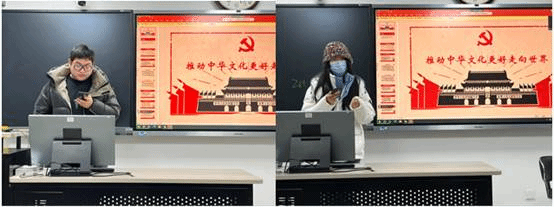 会议伊始,王一璇同学和王若熹同学对习语“推动中华文化更好走向世界”相关内容进行汇报。王一璇同学具体阐述了中华文明的特征和弘扬中华文化的意义,强调习近平总书记在党的二十大报告中提出的:坚守中华文化立场,提炼展示中华文明的精神标识和文化精髓,加快构建中国话语和中国叙事体系,讲好中国故事、传播好中国声音,展现可信、可爱、可敬的中国形象。这为开展文化传播工作,提高国家文化形象,提升中华文明的传播影响力,提供了根本遵循与战略指引,是世界文明演进中,中华文化助推提升中国国家实力与国际地位的重要方式和途径。接着王若熹同学分享了如何在新时代弘扬中华文化这个板块,她说到:只有既新火相传、代代守护,又顺时应势、推陈出新,才能把跨越时空、超越国界、富有永恒魅力、具有当代价值的文化精神弘扬起来,激活其生命力,让中华文明同各国人民创造的多彩文明一道,为人类提供正确精神指引。