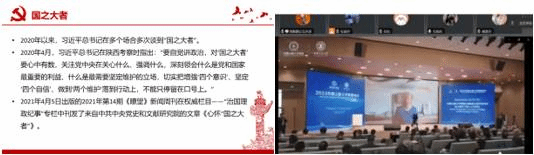 隆重举行。此外,自2020年以来,习近平总书记在多个场合多次谈到“国之大者”。邢雅静在会上为大家解释了“国之大者”的含义,她强调对于党员来说,让人民生活幸福就是“国之大者”,心系国之大者要求青年要树立远大志向。刘梦莉在讨论中表示,当代青年在选择职业和树立志向时,应跳出个人得失的小境界,心怀国内国际两个大局,让个人理想和中国梦同频共振,到祖国最需要的地方去,为国家的繁荣和进步贡献力量。