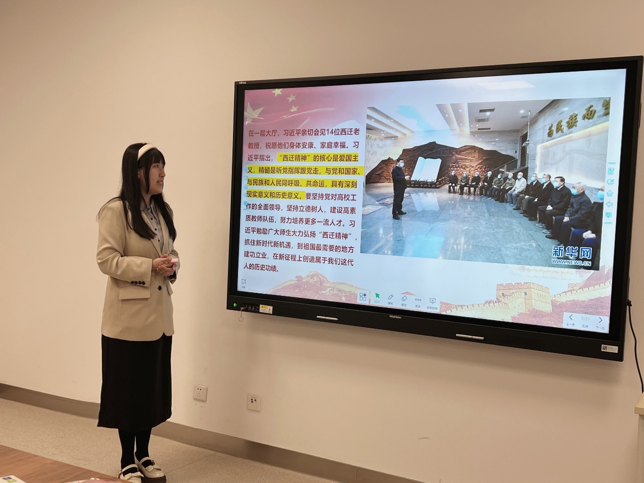 随后,支部成员共同观看西迁老教授口述访谈微视频,从西迁老教授的视角追溯回忆西迁往事,了解西迁前辈的求学生活、工作经历、西迁创业等方面的故事,聆听西迁前辈的亲切话语,重温那一段激情燃烧的岁月。观看视频过后,支部书记于欣欣分享了拜访西迁老教授卢志林的经历。卢志林老师已88岁高龄,1956年参加工作,1956年7月随原交通大学西迁至西安,担任污污漫