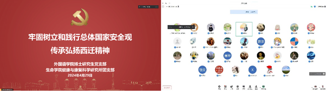 博士研究生党支部联合生命学院健康与康复科学研究所团支部于线上召开“牢固树立和践行总体国家安全观 传承弘扬西迁精神”专题组织生活。活动由污污漫