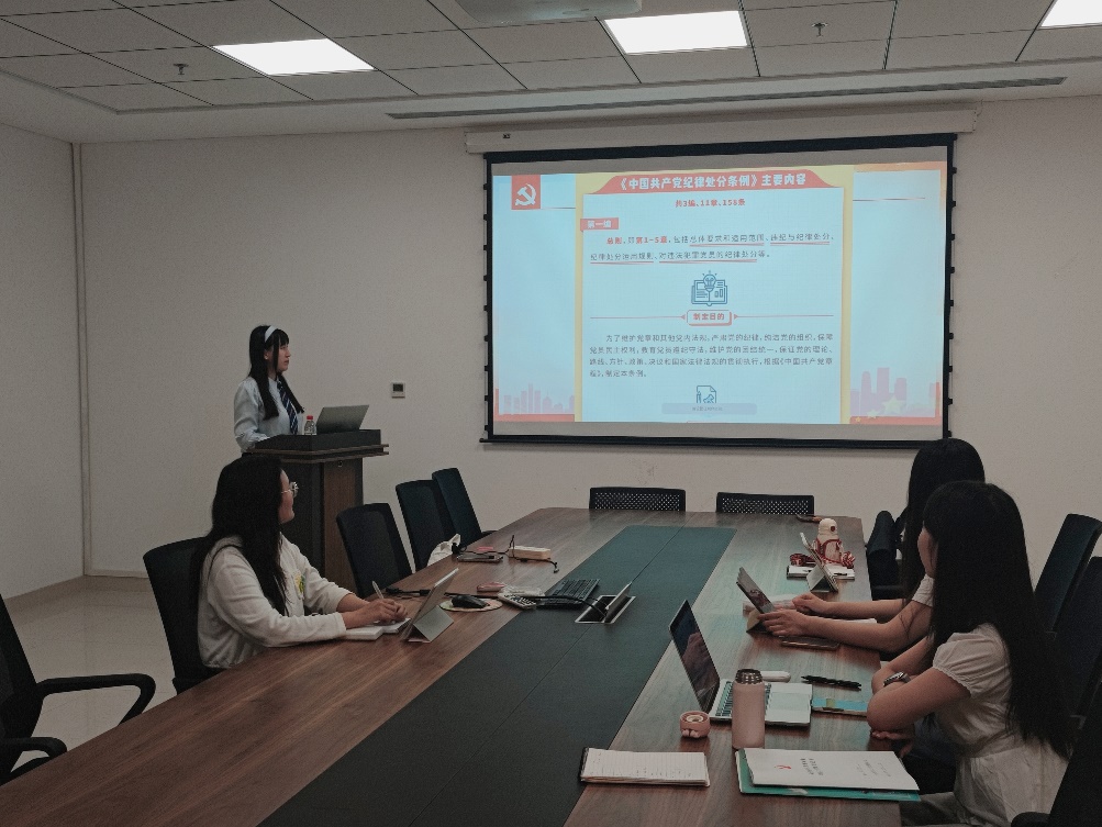 首先,于欣欣与支部成员深入学习了《中国共产党纪律处分条例》,从强化政治引领、坚定理想信念、坚持廉洁自律、增强纪律约束、加强道德建设、净化社交圈子、树牢底线意识、严格依法办事等八个方面展开学习,进一步严明政治纪律和政治规矩。
