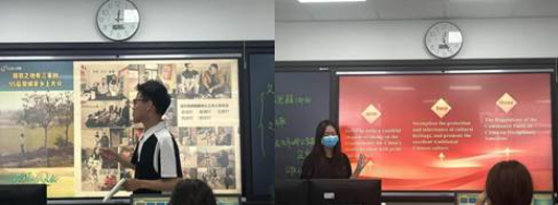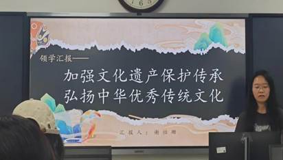 接着,英语三个小组成员就文化遗产保护依次进行了展示。英语一组谢怡珊同志做了以“加强文化遗产保护传承,弘扬中华优秀传统文化”为主题的领学汇报。她结合金鱼巷等多个成功案例,从保护、传承和利用三个维度,深入剖析了新时代下如何加强文化遗产的保护与传承,以及如何弘扬中华优秀传统文化。
