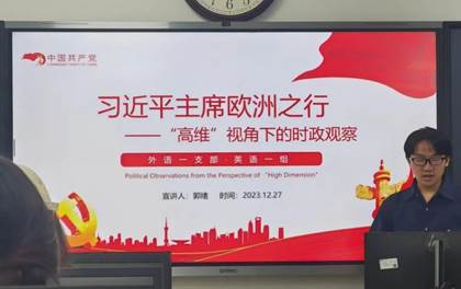 第三部分为党支部成员分享党史故事。英语一组郭绪同志围绕习近平主席的欧洲之行展开党史故事分享。郭绪同志从高质量共建一带一路、高水平经贸合作与高水平双边合作三个重要视角出发,深入阐述了习近平主席访法、访匈、访塞的历程和故事。郭绪同志还提到,访欧之旅展现了中国特色大国外交的进取姿态,彰显了中国作为负责任大国的形象,促进了中欧合作,为共同发展繁荣注入新动力。