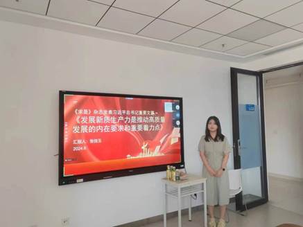 党员张佳玉同志介绍了习近平总书记在《求是》杂志上发表的重要文章《发展新质生产力是推动高质量发展的内在要求和重要着力点》。文章强调,新时代以来,党中央作出一系列重大决策部署,推动高质量发展成为全党全社会的共识和自觉行动。张佳玉还介绍了污污漫