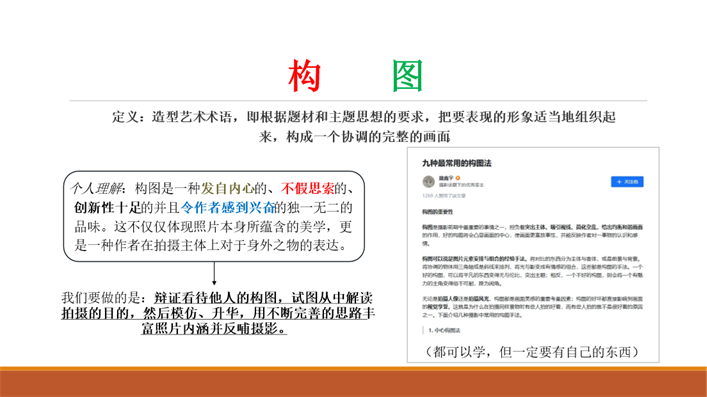 学生摄影学会会员耿毅超同学带来了主题为“风光摄影中的构图思路”的讲解。他以自己拍摄的照片为例,从自然人文、城市风光和动物拍摄三个方面讲述了不同情况中的构图技巧。在拍摄自然人文时,我们可以选择中心轴对称、水平或三分法等经典构图方式,也可以利用画面本身的特点,使用广角或长焦引导式、中心点突出式、虚实结合框架式和镜面反射等构图方法。在拍摄城市风光时,我们则可以使用广角引导、长焦放大局部特征和线性引导等方法。在拍摄动物时,我们则要注意透视关系,并要尽量使动物的动作趋势与画面协调。耿毅超同学表示,虽然构图在摄影中很重要,但是与竭尽全力地构图思索相比,享受本身弥足珍贵的旅行、奔赴期待已久的风景、结识萍水相逢的知己更能让照片蕴含更多的价值。至少,不要让一味追求构图的心态,阻碍了自己记录世界的脚步。