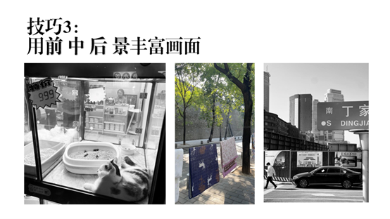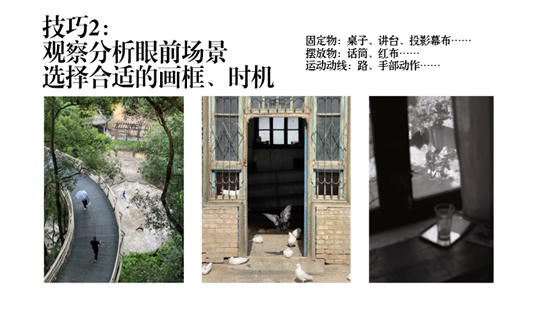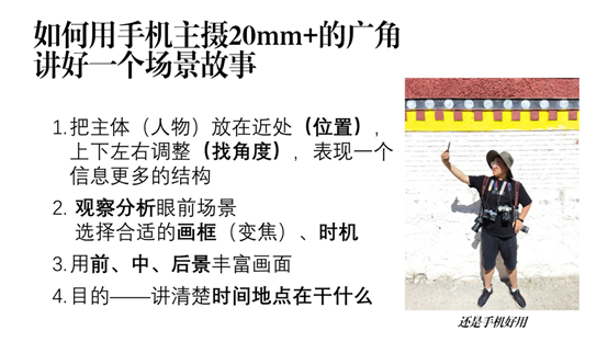 学生摄影学会会长游畅同学进行了主题为“如何用手机主摄20mm+的广角,讲好一个场景故事”的讲座。他表示,在拍摄时,我们要决定的第一步就是透视与画框的选取,它们分别通过走动和变焦来完成。要想利用好走动和变焦讲好一个场景故事,我们可以尝试以下三个技巧:(1)把主体放在近处,然后上下左右调整找角度;(2)观察分析眼前场景,选取合适的画框和时机;(3)用前、后、中景来丰富画面。游畅同学选择了自己的拍摄作品进行了详细的分析,并指出一张照片要想讲好场景故事,应清楚表达出时间、地点和在干什么这三个方面,因此在使用手机主摄20mm+的广角拍摄一些活动照片时,我们要注意照片内容是否包含了这三要素。