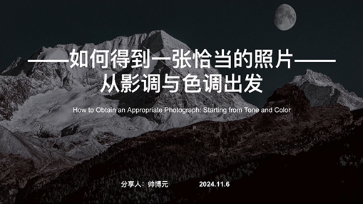 学生摄影学会第42届副会长帅博元同学带来了主题为“如何得到一张恰当的照片:从影调和色调中出发”的讲解。他介绍了什么是影调与色调、直方图的作用以及如何利用直方图得到一张恰当的照片,说明了如何在后期从色彩的角度调整照片,并通过案例讲解演示了用软件Lightroom对照片进行美化的方法。帅博元同学表示,对于一张照片,其影调是基础,我们应先求得正确的影调,后调整色调。在非特殊情况下,照片的明暗应当均匀,以达到舒适的观感,并且我们可以在后期通过调整色调、色温和色相,使图片文件中的色彩数码信息按照我们想要的方式映射成真实的色彩。