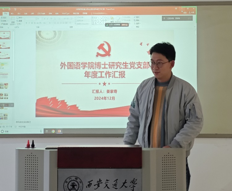 支部书记姜家奇从发展党员情况、思想理论学习、支部共建、特色活动、新闻宣传、业务提升、志愿服务与社会实践等方面回顾了支部本年度开展的各项工作。此外,他总结了支部目前在理论学习、社会实践等方面存在的不足,并提出相应的整改措施。