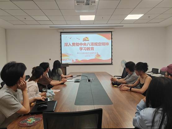 硕4122班党支部在涵英楼5-5077开展了“深入贯彻中央八项规定精神学习教育”主题组织生活,旨在通过理论学习,结合实际生活案例,进一步增强党员廉洁自律意识,推动支部作风建设。全体党支部成员参与此次学习,党支部书记聂骁驰主持本次活动。
