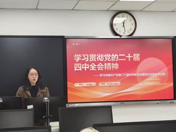 随后,刘乙璇同学就党的二十届四中全会精神作专题领学。她以会议背景与重大意义、公报核心内容、重点学习要点及实践要求四大模块为领学核心,系统解读“十五五”规划建议的核心要义。讲解从“十四五”时期我国经济社会发展取得的历史性成就切入,进一步阐释“十五五”时期“六个坚持”重要原则的实践基础,并围绕重点工作部署展开说明。整场汇报条理清晰、重点突出,有效帮助支部成员准确把握全会精神,明确自身在中国式现代化建设新征程中的责任与方向。