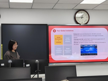 最后,沈思珵同学对本次会议所学内容进行英文总结。在介绍四大全球倡议时,她结合2024年世界互联网大会乌镇峰会全球发展倡议数字合作论坛、2025年第十二届北京香山论坛等国际实例,阐述中国在全球发展、安全、文明和治理方面的理念与实践。在二十届四中全会精神解读中,她围绕全会精神,重点解读全会对“十五五”规划的部署,并强调规划对推进中国式现代化的重要作用。在红岩精神分享板块,她讲述革命先烈的事迹和“狱中八条”的时代价值,展现红色精神的传承伟力。