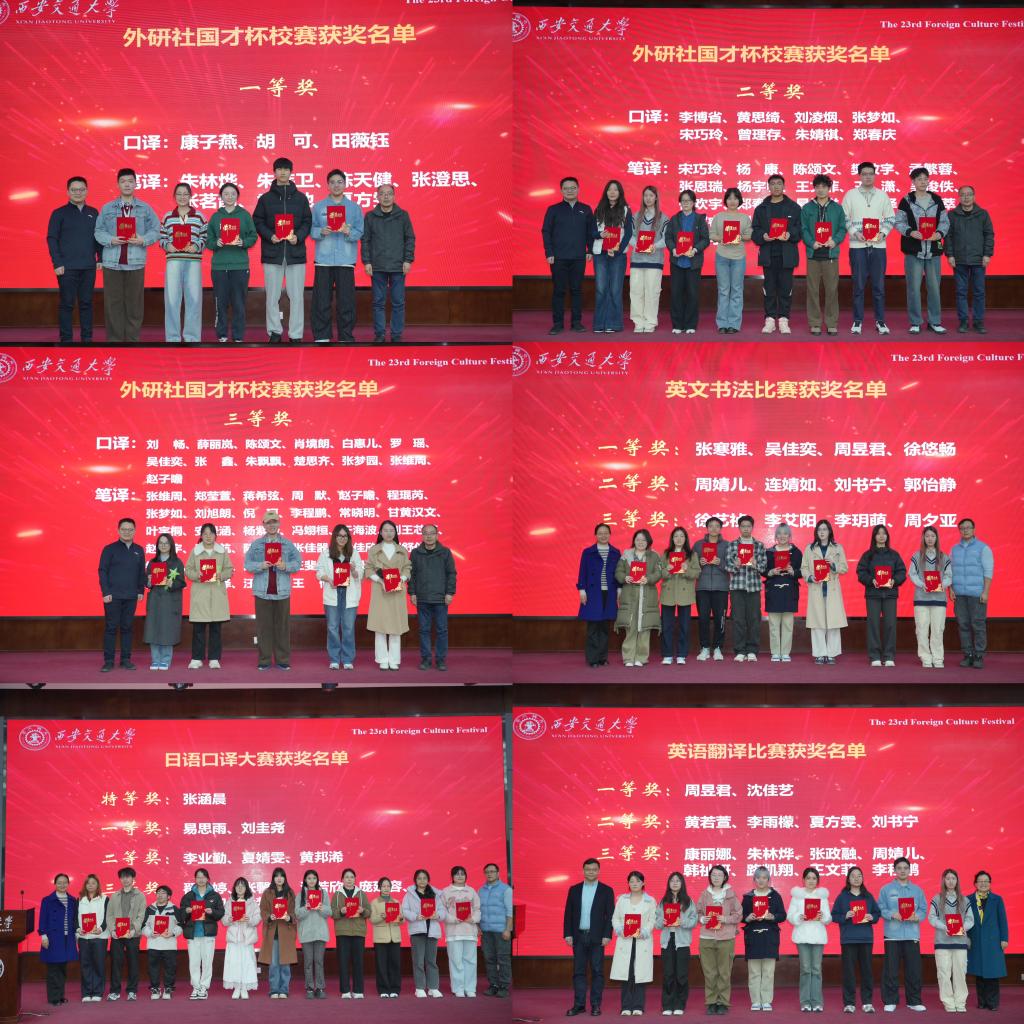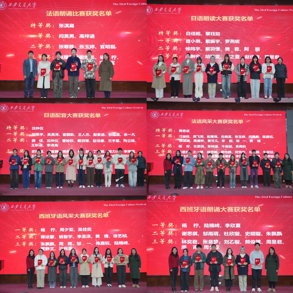 ”英语口语视频大赛、西班牙语书法、朗诵、风采大赛,法语演讲、朗诵、风采大赛,2025年外研社国才杯英语口译、笔译大赛校内选拔赛,游园晚会等23项精彩活动,吸引了5000余人次本研学生参与,超500余人次获奖。