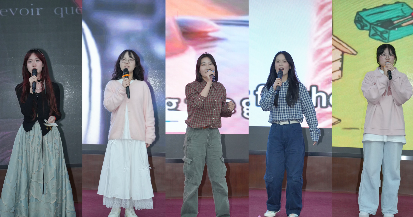 楚思齐、黄邦浠、易思雨、张鑫、宋巧玲五位研一同学接力献唱外文歌曲,歌声跨越三种语言,展现多元文化融合的魅力。